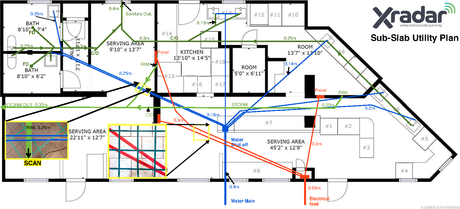 Combining utility locating and Xradar ™ concrete scanning, Xradar was able to identify the full interior sanitary network connecting all sinks, drains, vents and toilets as well as locating and differentiating from the storm drain flowing from the rain water leaders.
